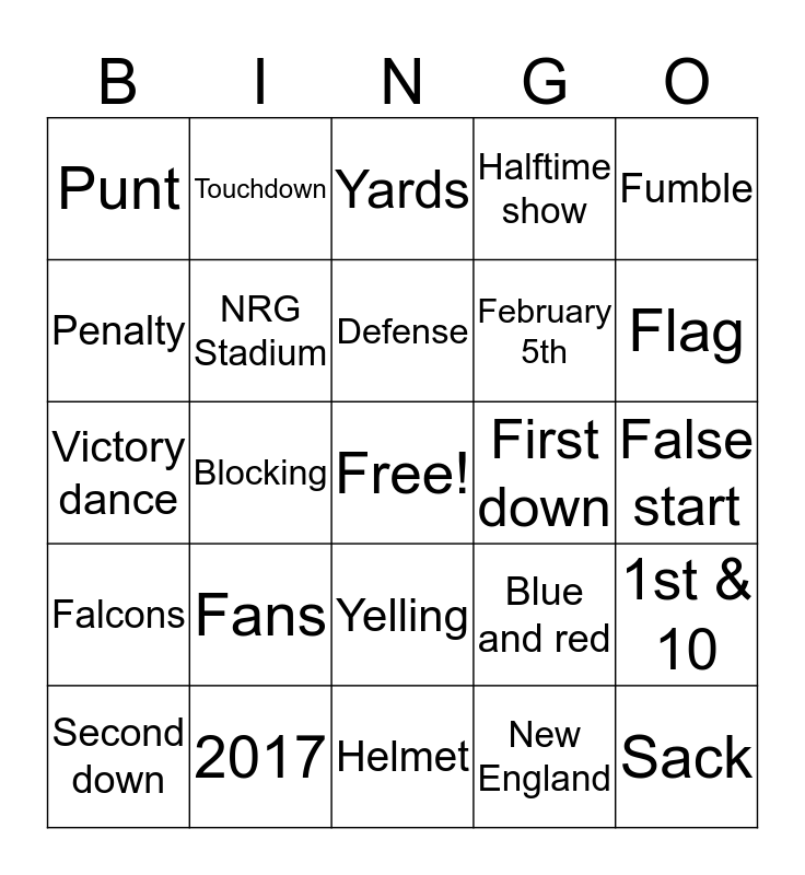 This bingo card has a free space and 60 words: Super bowl, 2017, Patriots, Falcons, New England, Atlant, NRG Stadium, Houston, Texas, February 5th, Lady Gaga, Halftime show, Off sides, Penalty, Quarter back, Running back, Punt, Sack, Fumble, Offense, Defense, First down, Yards, Second down, 1st & 10, Catch, Challenge, Coach, Field, Flag, Jersey, Playbook, Score, Pass, Referee, Touchdown, Football, Field goal, Blocking, Commercial, Victory dance, Interception, Fans, False start, Red and black, Blue and red, Tom Brady, Matt Ryan, Go team, Blitz, Yelling, Helmet, Food, Tight end, Third down, Fourth down, Full back, Out of bounds, Incomplete, Center and Line back.