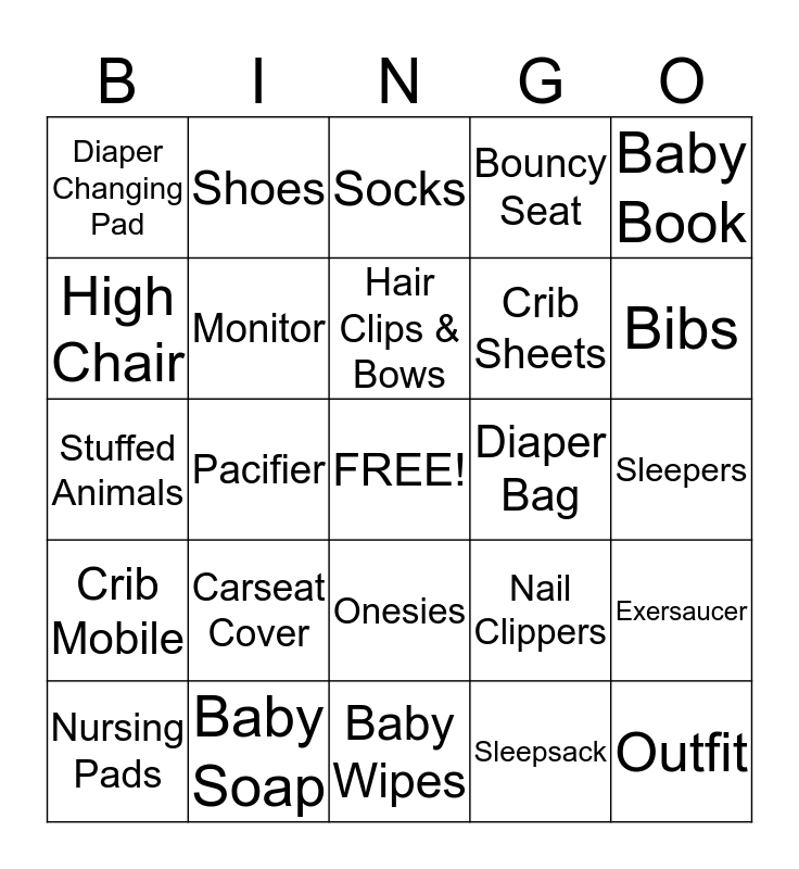 This bingo card has a free space and 30 words: Baby Soap, Baby Lotion, Pacifier, Story Books, Diaper Changing Pad, Socks, Monitor, Onesies, Diaper Bag, Baby Wipes, Sleepers, Outfit, Sleepsack, Washcloths, Bibs, Silverware, Nail Clippers, Crib Mobile, Carseat Cover, Baby Book, Stuffed Animals, Cloth Diapers, Shoes, Crib Sheets, High Chair, Bouncy Seat, Exersaucer, Nursing Pads, Hair Clips & Bows and Pacifier Clip.