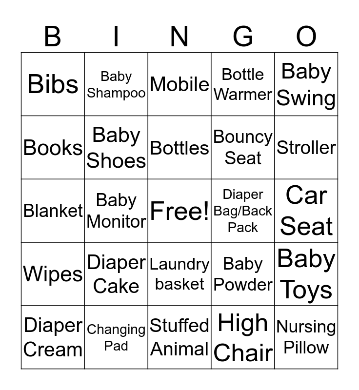 This bingo card has a free space and 24 words: Diaper Cake, Changing Pad, Bottles, Diaper Cream, Baby Swing, Bibs, Books, Baby Shampoo, Diaper Bag/Back Pack, Laundry basket, Bouncy Seat, Blanket, Baby Powder, Baby Toys, Baby Shoes, High Chair, Car Seat, Mobile, Stroller, Baby Monitor, Nursing Pillow, Wipes, Bottle Warmer and Stuffed Animal.