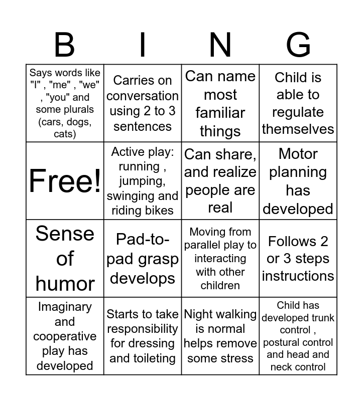 This bingo card has 16 words: Starts to take responsibility for dressing and toileting, Follows 2 or 3 steps instructions, Can name most familiar things, Says words like "I" , "me" , "we" , "you" and some plurals (cars, dogs, cats), Sense of humor, Carries on conversation using 2 to 3 sentences, Moving from parallel play to interacting with other children, Night walking is normal helps remove some stress, Free!, Active play: running , jumping, swinging and riding bikes, Imaginary and cooperative play has developed, Child is able to regulate themselves, Pad-to-pad grasp develops, Motor planning has developed, Can share, and realize people are real and Child has developed trunk control , postural control and head and neck control.