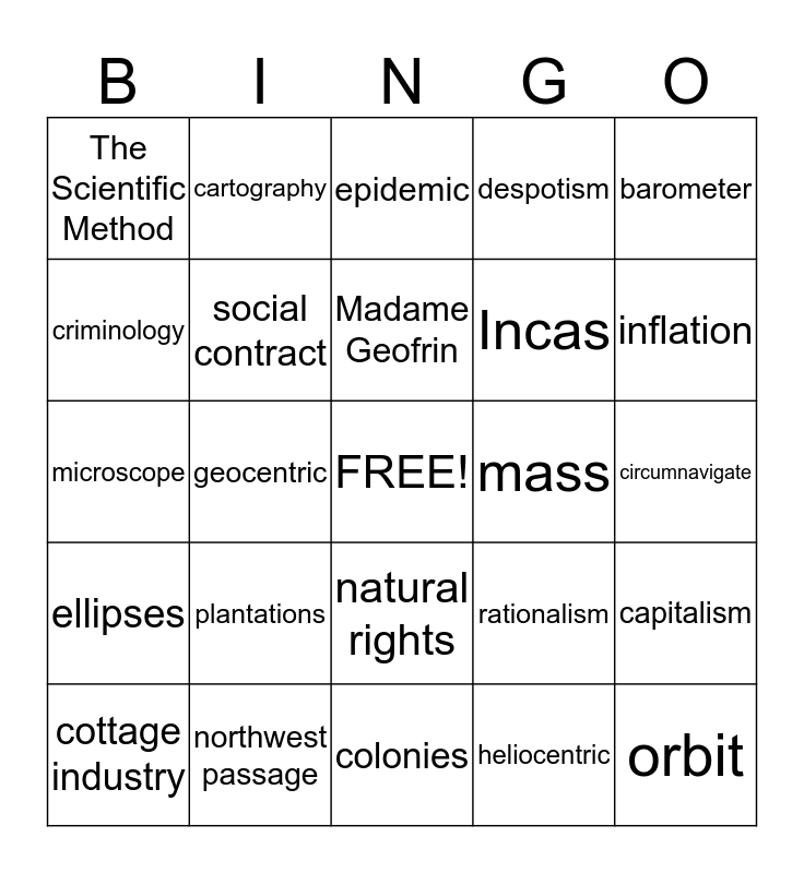 This bingo card has a free space and 35 words: Salons, humanism, Leviathan, social contract, natural rights, despotism, criminology, capital punishment, Madame Geofrin, The Enlightenment, microscope, barometer, thermometer, hypothesis, The Scientific Method, mass, heliocentric, geocentric, ellipses, orbit, rationalism, cottage industry, capitalism, northwest passage, epidemic, inflation, Montezuma, Aztecs, Incas, circumnavigate, strait, colonies, plantations, cartography and caravel.
