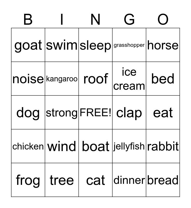 This bingo card has a free space and 24 words: wind, tree, roof, frog, horse, goat, noise, swim, clap, boat, ice cream, dog, jellyfish, rabbit, kangaroo, dinner, eat, sleep, bed, strong, bread, chicken, grasshopper and cat.