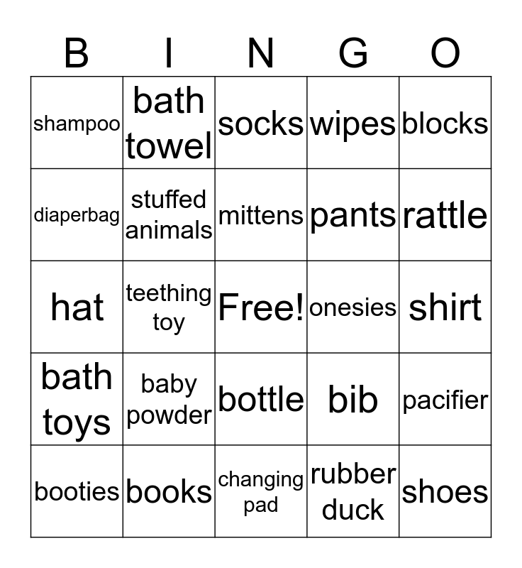This bingo card has a free space and 24 words: baby powder, books, mittens, booties, blocks, shampoo, diaperbag, bath towel, onesies, bottle, pants, hat, bib, pacifier, stuffed animals, rubber duck, shirt, socks, rattle, teething toy, shoes, bath toys, wipes and changing pad.