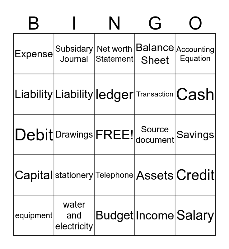 This bingo card has a free space and 24 words: stationery, water and electricity, ledger, equipment, Accounting Equation, Expense, Liability, Subsidary Journal, Source document, Telephone, Transaction, Debit, Assets, Credit, Liability, Income, Savings, Net worth Statement, Cash, Drawings, Salary, Capital, Balance Sheet and Budget.