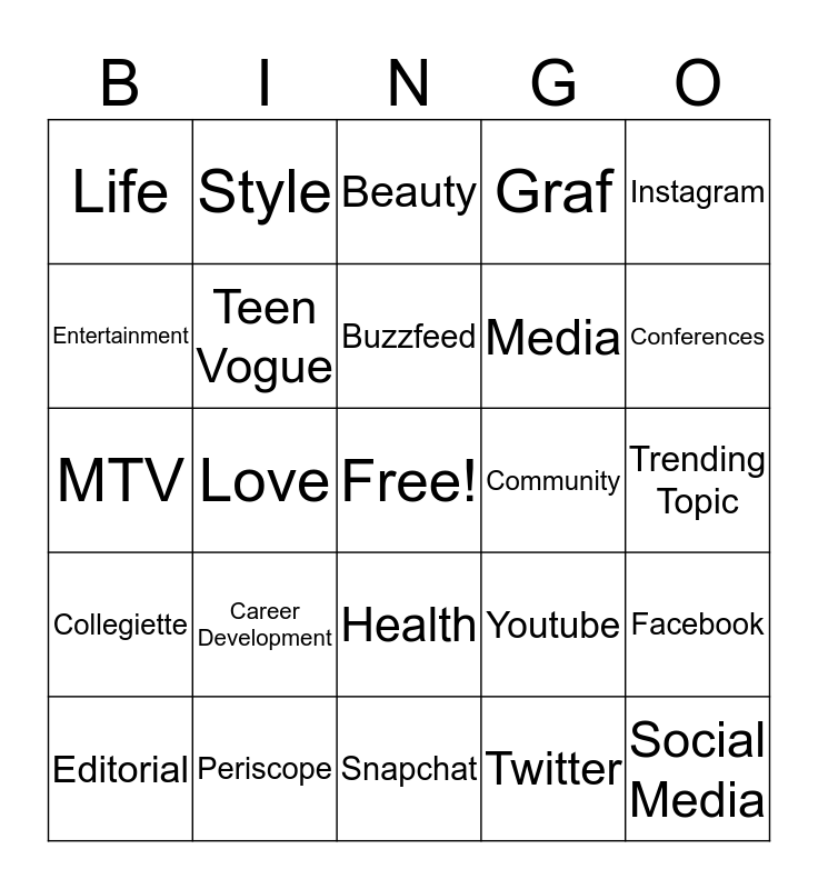 This bingo card has a free space and 24 words: Career Development, Periscope, Buzzfeed, Editorial, Instagram, Life, Entertainment, Style, Community, Health, Media, MTV, Youtube, Facebook, Teen Vogue, Twitter, Trending Topic, Beauty, Conferences, Love, Social Media, Collegiette, Graf and Snapchat.