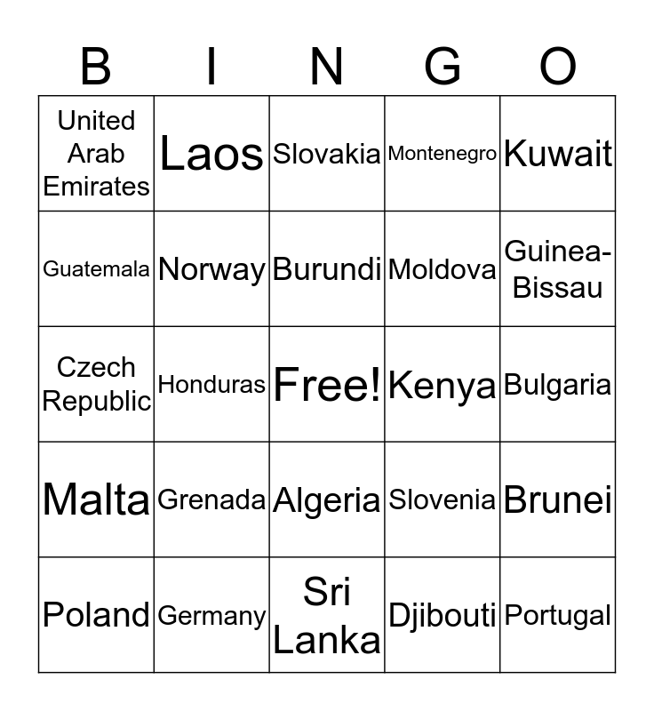 This bingo card has a free space and 87 words: Afghanistan, Albania, Algeria, Andorra, Angola, Antigua & Barbuda, Argentina, Armenia, Azerbaijan, Bahamas, Botswana, Brazil, Brunei, Bulgaria, Burkina Faso, Burundi, Cambodia, Cameroon, Canada, Cape Verde, Cuba, Cyprus, Czech Republic, Denmark, Djibouti, Dominica, Dominican Republic, DR Congo, Ecuador, Egypt, Germany, Ghana, Greece, Grenada, Guatemala, Guinea, Guinea-Bissau, Guyana, Haiti, Honduras, Japan, Jordan, Kazakhstan, Kenya, Kosovo, Kuwait, Kyrgyzstan, Laos, Latvia, Lebanon, Maldives, Mali, Malta, Mauritania, Mauritius, Mexico, Moldova, Monaco, Mongolia, Montenegro, Norway, Oman, Pakistan, Panama, Paraguay, Peru, Philippines, Poland, Portugal, Qatar, Sierra Leone, Singapore, Slovakia, Slovenia, Somalia, South Africa, South Korea, Sri Lanka, St. Kitts & Nevis, St. Lucia, Togo, Trinidad & Tobago, Tunisia, Turkmenistan, Uganda, United Arab Emirates and United States.