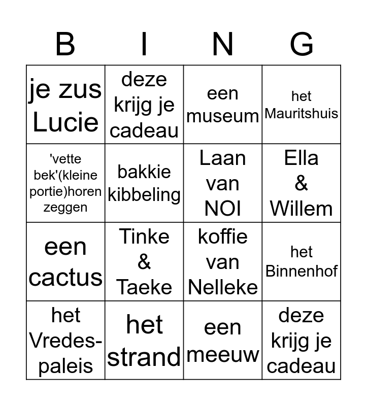 This bingo card has 16 words: het strand, het Binnenhof, een museum, je zus Lucie, een cactus, deze krijg je cadeau, koffie van Nelleke, een meeuw, 'vette bek'(kleine portie)horen zeggen, bakkie kibbeling, het Vredes-paleis, het Mauritshuis, Tinke & Taeke, Ella & Willem, Laan van NOI and deze krijg je cadeau.
