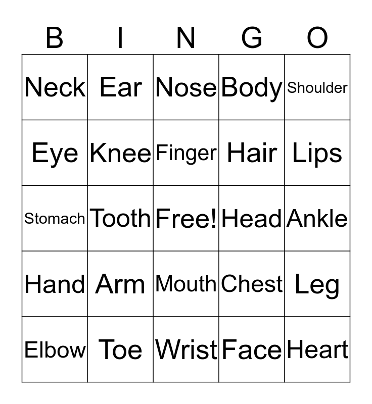 This bingo card has a free space and 25 words: Arm, Wrist, Finger, Elbow, Shoulder, Neck, Eye, Ear, Head, Mouth, Hair, Stomach, Chest, Leg, Knee, Foot, Ankle, Nose, Lips, Tooth, Heart, Toe, Hand, Body and Face.