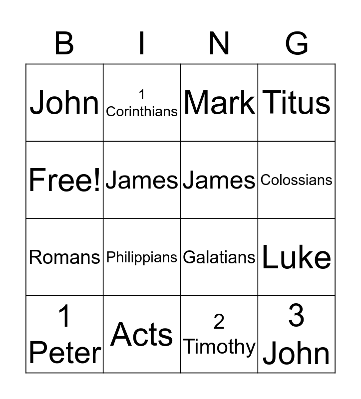 This bingo card has 16 words: Acts, Luke, Mark, John, Romans, 1 Corinthians, Galatians, 2 Timothy, Free!, James, 1 Peter, Titus, Philippians, Colossians, James and 3 John.