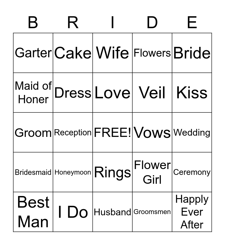 This bingo card has a free space and 24 words: Honeymoon, I Do, Love, Best Man, Bride, Garter, Maid of Honer, Cake, Vows, Rings, Veil, Groom, Flower Girl, Ceremony, Dress, Groomsmen, Wedding, Wife, Kiss, Reception, Happly Ever After, Bridesmaid, Flowers and Husband.