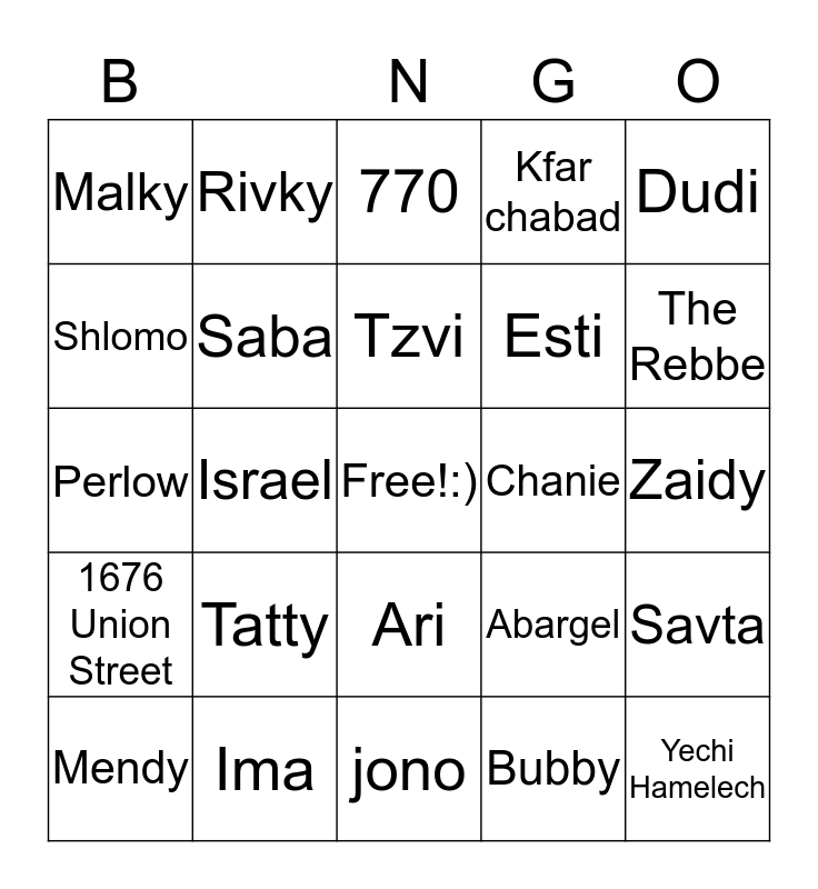 This bingo card has a free space and 24 words: Tatty, Ima, Tzvi, Mendy, Dudi, Malky, Shlomo, Rivky, Chanie, Ari, Esti, Perlow, Abargel, Savta, Saba, Bubby, Zaidy, 770, The Rebbe, Israel, Yechi Hamelech, 1676 Union Street, Kfar chabad and jono.