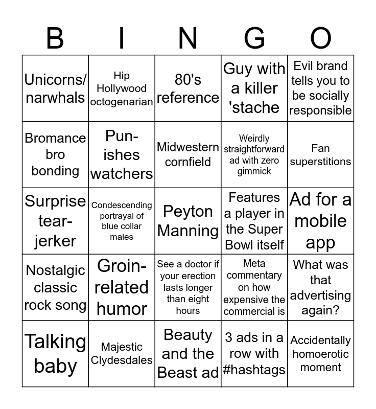 This bingo card has a free space and 24 words: Groin-related humor, Majestic Clydesdales, Midwestern cornfield, Talking baby, Evil brand tells you to be socially responsible, Unicorns/ narwhals, Bromance bro bonding, Hip Hollywood octogenarian, Features a player in the Super Bowl itself, See a doctor if your erection lasts longer than eight hours, Weirdly straightforward ad with zero gimmick, Surprise tear-jerker, Meta commentary on how expensive the commercial is, What was that advertising again?, Pun-ishes watchers, 3 ads in a row with #hashtags, Ad for a mobile app, 80's reference, Fan superstitions, Condescending portrayal of blue collar males, Accidentally homoerotic moment, Nostalgic classic rock song, Guy with a killer 'stache and Beauty and the Beast ad.