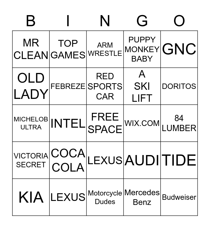 This bingo card has a free space and 24 words: COCA COLA, LEXUS, RED SPORTS CAR, KIA, GNC, MR CLEAN, OLD LADY, TOP GAMES, WIX.COM, LEXUS, A SKI LIFT, MICHELOB ULTRA, AUDI, TIDE, FEBREZE, Mercedes Benz, 84 LUMBER, ARM WRESTLE, DORITOS, INTEL, Budweiser, VICTORIA SECRET, PUPPY MONKEY BABY and Motorcycle Dudes.