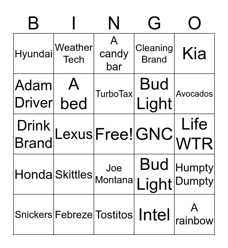 This bingo card has a free space and 38 words: Mr. Clean, Audi, Chips, A bed, Humpty Dumpty, Skittles, TurboTax, A horse, Kia, Bud Light, Lexus, Cleaning Brand, A rainbow, Life WTR, Adam Driver, Honda, Tom Brady, A candy bar, Bai, GNC, Hyundai, Febreze, Avocados, Snickers, Buick, Tostitos, Melissa McCarthy, Minnie Driver, 84 Lumber, Wix.com, GoDaddy, Joe Montana, Intel, Weather Tech, Justin Timberlake, Bud Light, Drink Brand and Persil.