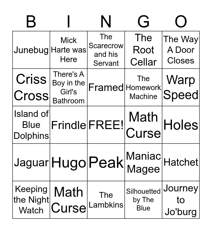 This bingo card has a free space and 24 words: Hugo, Math Curse, Framed, Keeping the Night Watch, The Way A Door Closes, Junebug, Criss Cross, Mick Harte was Here, Math Curse, Peak, The Homework Machine, Island of Blue Dolphins, Maniac Magee, Hatchet, There's A Boy in the Girl's Bathroom, Silhouetted by The Blue, Holes, The Scarecrow and his Servant, Warp Speed, Frindle, Journey to Jo'burg, Jaguar, The Root Cellar and The Lambkins.