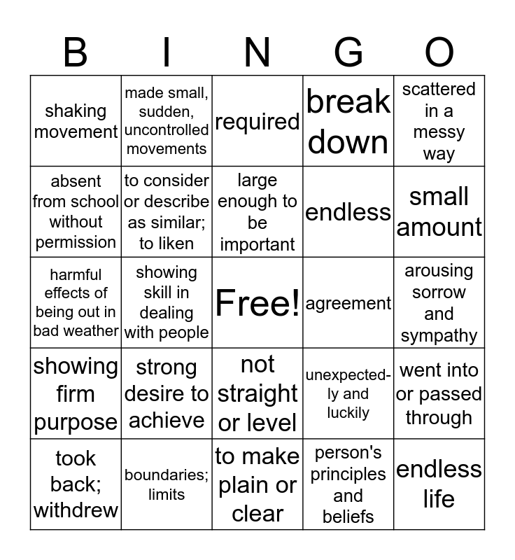 This bingo card has a free space and 24 words: strong desire to achieve, boundaries; limits, large enough to be important, took back; withdrew, scattered in a messy way, shaking movement, absent from school without permission, made small, sudden, uncontrolled movements, agreement, not straight or level, endless, harmful effects of being out in bad weather, unexpected-ly and luckily, went into or passed through, to consider or describe as similar; to liken, person's principles and beliefs, arousing sorrow and sympathy, required, small amount, showing skill in dealing with people, endless life, showing firm purpose, break down and to make plain or clear.