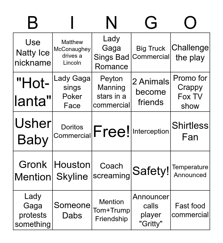 This bingo card has a free space and 31 words: Mention Tom+Trump Friendship, Concussion Discussion, Doritos Commercial, Bud Light Commercial, Use Natty Ice nickname, Lady Gaga Sings Bad Romance, Lady Gaga sings Poker Face, Safety!, Interception, Announcer calls player "Gritty", Shirtless Fan, Fast food commercial, Deflategate mention, Celebrity in the Stands, Promo for Crappy Fox TV show, Giselle Close up, Temperature Announced, Houston Skyline, Gronk Mention, Coach screaming, Challenge the play, Shake those pom poms, Lady Gaga protests something, Matthew McConaughey drives a Lincoln, 2 Animals become friends, "Hot-lanta", Big Truck Commercial, Usher Baby, Someone Dabs, Peyton Manning stars in a commercial and "You're not you when you're hungry".