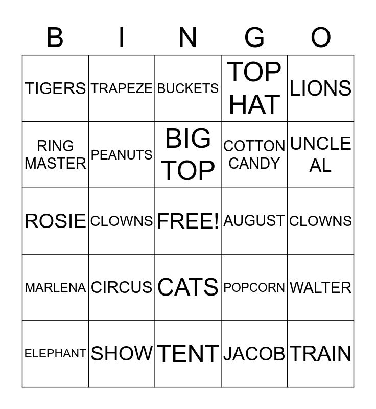 This bingo card has a free space and 25 words: CIRCUS, TENT, BIG TOP, ELEPHANT, LIONS, TIGERS, RING MASTER, TRAPEZE, AUGUST, CATS, COTTON CANDY, ROSIE, POPCORN, WALTER, PEANUTS, SHOW GIRLS, CLOWNS, BUCKETS, UNCLE AL, CLOWNS, TRAIN, SHOW, MARLENA, TOP HAT and JACOB.