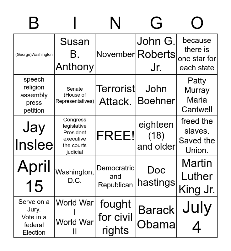 This bingo card has a free space and 29 words: Serve on a Jury. Vote in a federal Election, Capitalist economy. Market economy., Congress legislative President executive the courts judicial, Ney York (Harbor) Liberty Island, (George)Washington, November, Senate (House of Representatives), Washington, D.C., eighteen (18) and older, World War I World War II, freed the slaves. Saved the Union., July 4, fought for civil rights, Barack Obama, Patty Murray Maria Cantwell, Olympia, Democratric and Republican, April 15, because there is one star for each state, Jay Inslee, Doc hastings, Joe Biden, John Boehner, speech religion assembly press petition, John G. Roberts Jr., Susan B. Anthony, Martin Luther King Jr., Terrorist Attack. and Mississippi River..