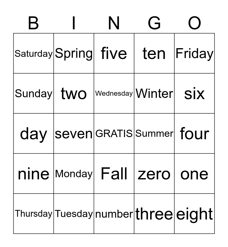 This bingo card has a free space and 24 words: Monday, Tuesday, Wednesday, Thursday, Friday, Saturday, Sunday, Spring, Summer, Fall, Winter, day, zero, one, two, three, four, five, six, seven, eight, nine, ten and number.
