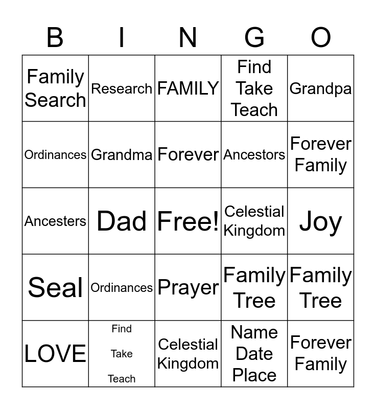 This bingo card has a free space and 33 words: Temple, Mom, Dad, Baby, Seal, Grandma, Grandpa, LOVE, Research, Testimony, Forever, FAMILY, Home, Immigrant, Celestial Kingdom, Forever Family, Find Take Teach, Ancesters, Ordinances, Family Tree, Prayer, Name Date Place, Family Search, Joy, Celestial Kingdom, Forever Family, Find Take Teach, Ancestors, Ordinances, Family Tree, Pray, Name Date Place and FamilySearch.