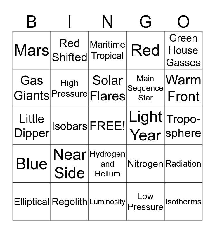 This bingo card has a free space and 24 words: Near Side, Regolith, Solar Flares, Elliptical, Green House Gasses, Mars, Gas Giants, Red Shifted, Light Year, Hydrogen and Helium, Main Sequence Star, Little Dipper, Nitrogen, Radiation, High Pressure, Low Pressure, Tropo-sphere, Maritime Tropical, Warm Front, Isobars, Isotherms, Blue, Red and Luminosity.