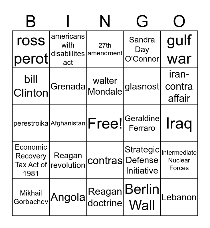 This bingo card has a free space and 25 words: Reagan revolution, Reagan doctrine, walter Mondale, Mikhail Gorbachev, gulf war, ross perot, bill Clinton, americans with disablilites act, Geraldine Ferraro, contras, glasnost, perestroika, Strategic Defense Initiative, Intermediate Nuclear Forces, Grenada, reagonmics, Iraq, 27th amendment, iran-contra affair, Afghanistan, Lebanon, Angola, Economic Recovery Tax Act of 1981, Sandra Day O'Connor and Berlin Wall.