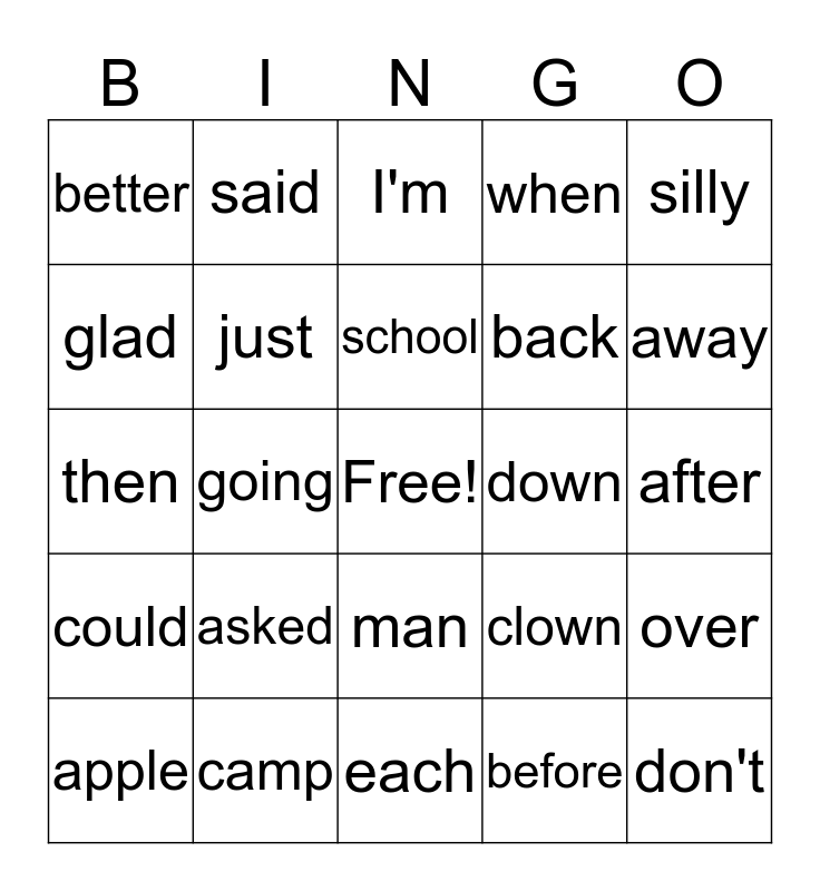 This bingo card has a free space and 24 words: asked, camp, school, apple, silly, better, glad, said, down, man, back, then, clown, over, just, before, after, I'm, away, going, don't, could, when and each.