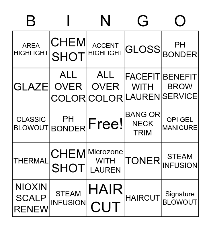 This bingo card has a free space and 24 words: CHEM SHOT, STEAM INFUSION, ALL OVER COLOR, NIOXIN SCALP RENEW, PH BONDER, AREA HIGHLIGHT, GLAZE, CHEM SHOT, BANG OR NECK TRIM, Microzone WITH LAUREN, FACEFIT WITH LAUREN, CLASSIC BLOWOUT, TONER, STEAM INFUSION, ALL OVER COLOR, HAIRCUT, OPI GEL MANICURE, ACCENT HIGHLIGHT, BENEFIT BROW SERVICE, PH BONDER, Signature BLOWOUT, THERMAL, GLOSS and HAIR CUT.