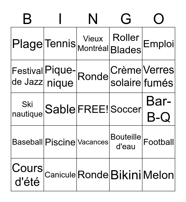 This bingo card has a free space and 27 words: Bouteille d'eau, Chapeau, Crème solaire, Ronde, Festival de Jazz, Vieux Montréal, Tennis, Baseball, Soccer, Football, Ski nautique, Roller Blades, Cours d'été, Canicule, Verres fumés, Crême glacée, Pique-nique, Ronde, Piscine, Plage, Bar-B-Q, Bikini, Sable, Melon, Vacances, Emploi and Coup de soleil.