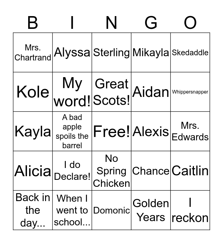 This bingo card has a free space and 27 words: Chance, Jude, Aidan, Domonic, Kole, Sterling, Alyssa, Alicia, Alexis, Caitlin, Kayla, Mikayla, Back in the day..., When I went to school..., Whippersnapper, You can lead a horse..., My word!, Great Scots!, I do Declare!, Mrs. Chartrand, Mrs. Edwards, Golden Years, A bad apple spoils the barrel, I reckon, No Spring Chicken, Skedaddle and Skin of your teeth.
