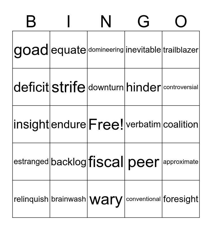 This bingo card has a free space and 24 words: backlog, brainwash, downturn, relinquish, trailblazer, goad, deficit, equate, verbatim, fiscal, hinder, insight, peer, approximate, strife, conventional, coalition, domineering, controversial, endure, foresight, estranged, inevitable and wary.