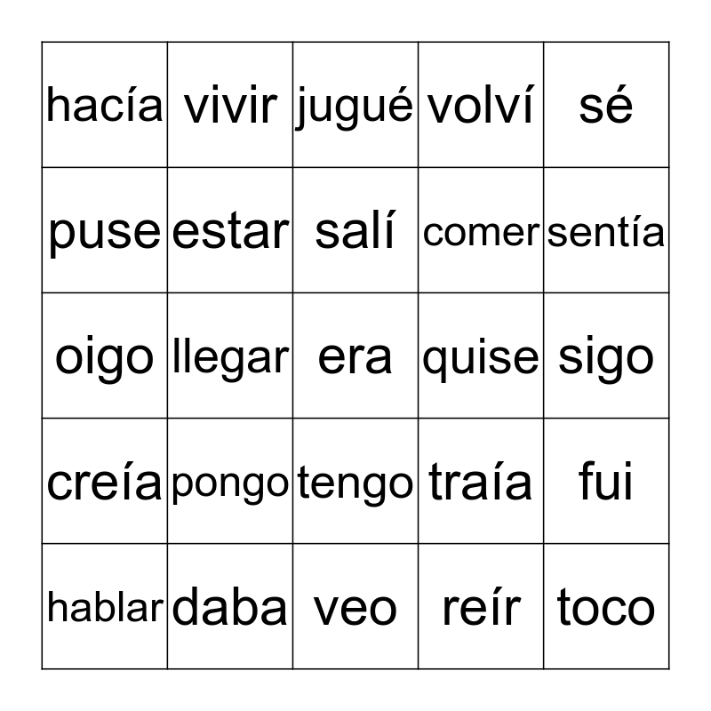This bingo card has a free space and 24 words: pongo, daba, salí, hablar, sé, hacía, puse, vivir, quise, tengo, comer, oigo, traía, fui, estar, reír, sigo, jugué, sentía, llegar, toco, creía, volví and veo.