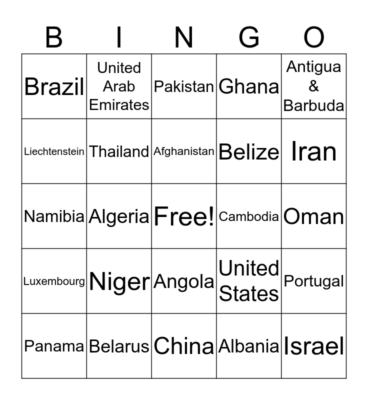 This bingo card has a free space and 27 words: United States, Mexico, Belize, China, Liechtenstein, Pakistan, United Arab Emirates, Luxembourg, Cambodia, Portugal, Namibia, Ghana, Panama, Belarus, Iran, Botswana, Thailand, Afghanistan, Niger, Brazil, Oman, Albania, Algeria, Israel, Angola, Antigua & Barbuda and Argentina.