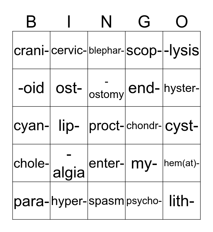 This bingo card has a free space and 24 words: -algia, hyper-, -ostomy, para-, -lysis, crani-, -oid, cervic-, chondr-, enter-, end-, cyan-, my-, hem(at)-, ost-, psycho-, cyst-, blephar-, hyster-, lip-, lith-, chole-, scop- and spasm.