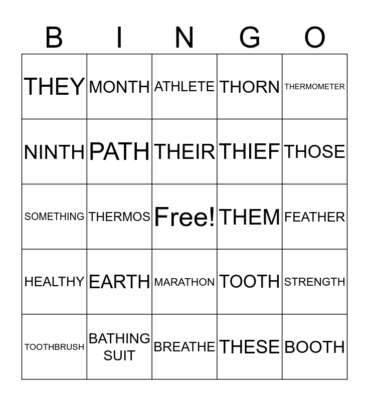 This bingo card has a free space and 52 words: BATH, BOOTH, BOTH, BREATHE, EARTH, MATH, MONTH, MOUTH, NINTH, NORTH, PATH, SMOOTH, STRENGTH, TOOTH, THANK YOU, THAT, THEIR, THEM, THERE, THERMOMETER, THERMOS, THESE, THEY, THIEF, THINK, THIRSTY, THIRTEEN, THIS, THOSE, THREAD, THREE, THORN, THUNDER, THURSDAY, ANOTHER, ATHLETE, BATHING SUIT, BATHROBE, BATHTUB, BIRTHDAY, BROTHER, FEATHER, HEALTHY, LEATHER, MARATHON, MOTHER, PYTHON, SOMETHING, STETHOSCOPE, TOGETHER, TOOTHBRUSH and WEATHER.