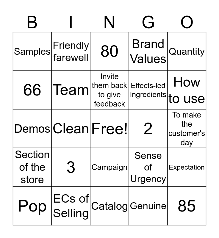 This bingo card has a free space and 24 words: 3, ECs of Selling, Invite them back to give feedback, Pop, Quantity, Samples, 66, Friendly farewell, 2, Campaign, Effects-led Ingredients, Demos, Sense of Urgency, Expectation, Team, Genuine, To make the customer's day, 80, How to use, Clean, 85, Section of the store, Brand Values and Catalog.