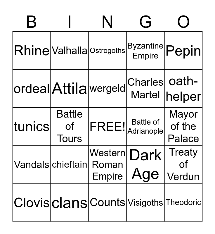 This bingo card has a free space and 24 words: chieftain, clans, wergeld, Clovis, Pepin, Rhine, ordeal, Valhalla, Battle of Adrianople, Western Roman Empire, Charles Martel, tunics, Dark Age, Treaty of Verdun, Attila, Visigoths, Mayor of the Palace, Ostrogoths, oath-helper, Battle of Tours, Theodoric, Vandals, Byzantine Empire and Counts.