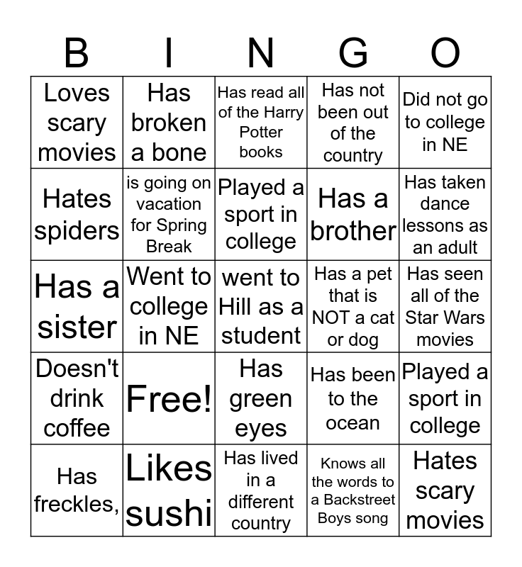 This bingo card has 25 words: Free!, Has lived in a different country, Played a sport in college, Has freckles,, Did not go to college in NE, Loves scary movies, Hates spiders, Has broken a bone, Has a pet that is NOT a cat or dog, Has green eyes, Has a brother, Has a sister, Has been to the ocean, Played a sport in college, is going on vacation for Spring Break, Hates scary movies, Has seen all of the Star Wars movies, Has read all of the Harry Potter books, Has taken dance lessons as an adult, Went to college in NE, went to Hill as a student, Likes sushi, Doesn't drink coffee, Has not been out of the country and Knows all the words to a Backstreet Boys song.