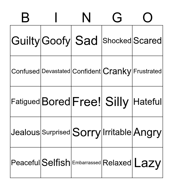 This bingo card has a free space and 45 words: Laughing, Lazy, Mean, Peaceful, Proud, Relaxed, Sad, Satisfied, Scared, Selfish, Shocked, Silly, Sorry, Surprised, Worried, Embarrassed, Excited, Fatigued, Frightened, Frustrated, Goofy, Grieving, Grouchy, Guilty, Happy, Hateful, Hurt, Interested, Irritable, Jealous, Affectionate, Angry, Anxious, Ashamed, Attentive, Bored, Brave, Cheerful, Concerned, Confident, Confused, Cranky, Depressed, Devastated and Eager.
