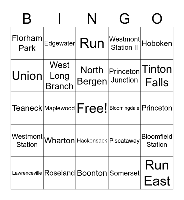This bingo card has a free space and 24 words: Wharton, Roseland, North Bergen, Lawrenceville, Hoboken, Florham Park, Union, Edgewater, Bloomingdale, Hackensack, Princeton Junction, Teaneck, Piscataway, Bloomfield Station, West Long Branch, Somerset, Princeton, Run, Tinton Falls, Maplewood, Run East, Westmont Station, Westmont Station II and Boonton.