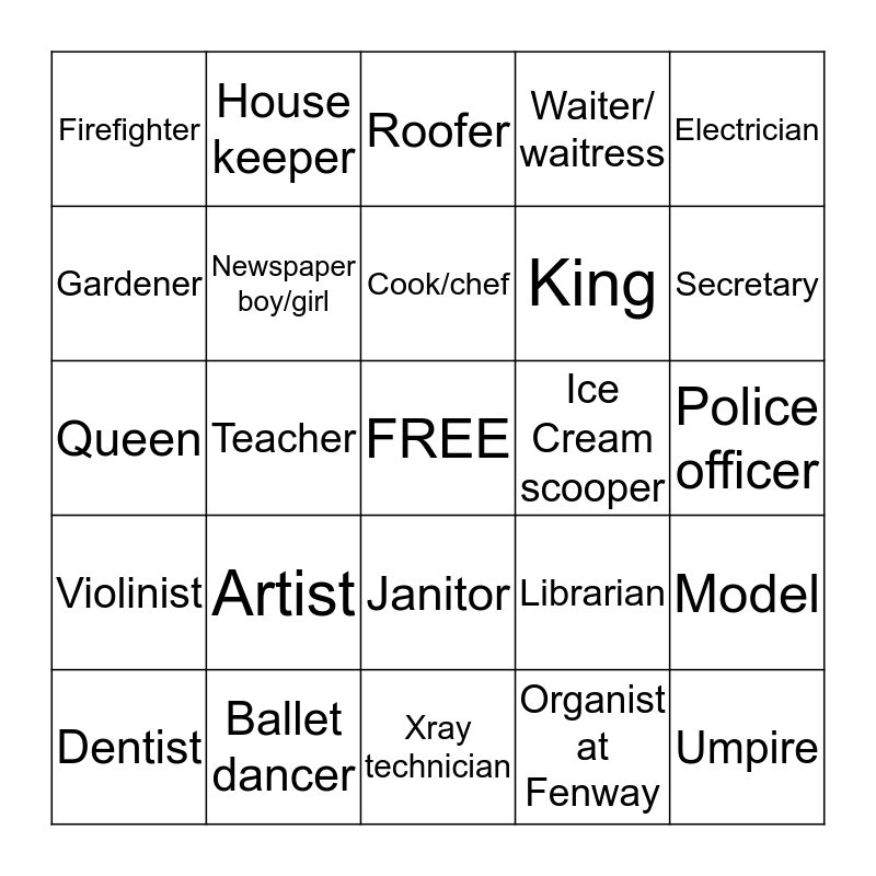 This bingo card has a free space and 24 words: Artist, Ballet dancer, Cook/chef, Dentist, Electrician, Firefighter, Gardener, House keeper, Ice Cream scooper, Janitor, King, Queen, Librarian, Model, Newspaper boy/girl, Organist at Fenway, Police officer, Roofer, Secretary, Teacher, Umpire, Violinist, Waiter/ waitress and Xray technician.