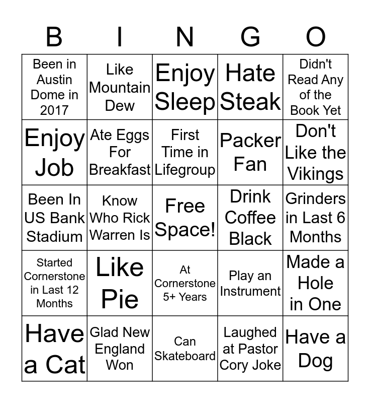 This bingo card has a free space and 24 words: Like Pie, Glad New England Won, First Time in Lifegroup, Have a Cat, Didn't Read Any of the Book Yet, Been in Austin Dome in 2017, Enjoy Job, Like Mountain Dew, Drink Coffee Black, At Cornerstone 5+ Years, Packer Fan, Been In US Bank Stadium, Play an Instrument, Made a Hole in One, Ate Eggs For Breakfast, Laughed at Pastor Cory Joke, Grinders in Last 6 Months, Enjoy Sleep, Don't Like the Vikings, Know Who Rick Warren Is, Have a Dog, Started Cornerstone in Last 12 Months, Hate Steak and Can Skateboard.