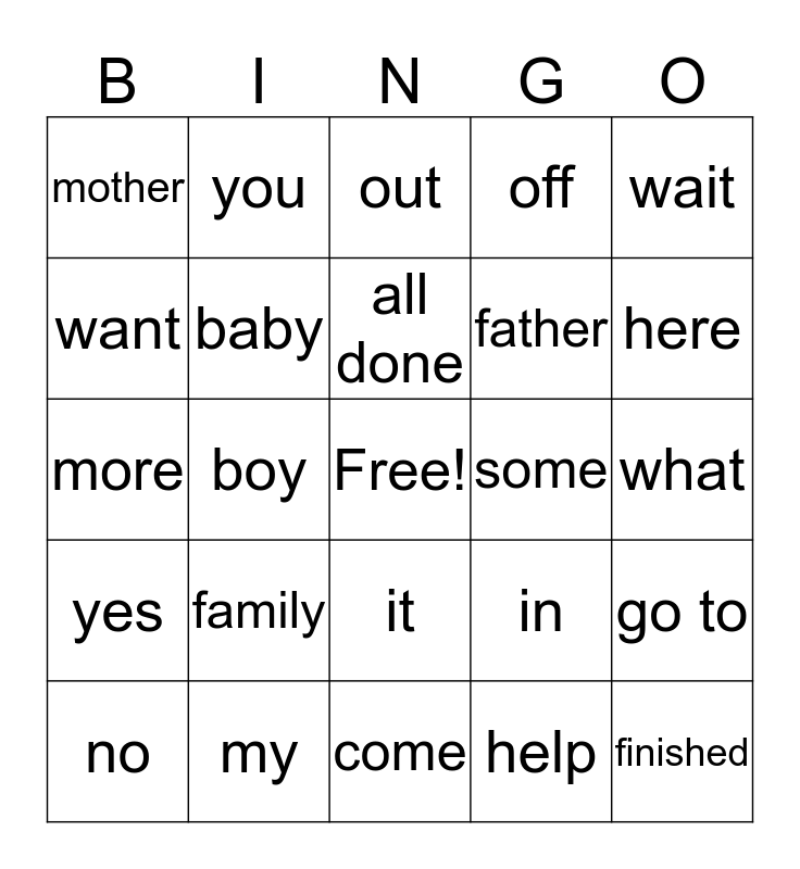This bingo card has a free space and 24 words: family, my, all done, no, wait, mother, want, you, some, it, father, more, in, go to, baby, help, what, out, here, boy, finished, yes, off and come.