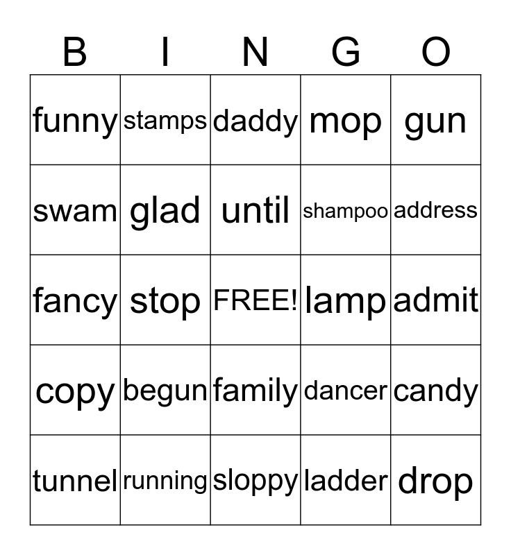This bingo card has a free space and 24 words: begun, running, until, tunnel, gun, funny, swam, stamps, lamp, family, shampoo, fancy, dancer, candy, glad, ladder, admit, daddy, address, stop, drop, copy, mop and sloppy.