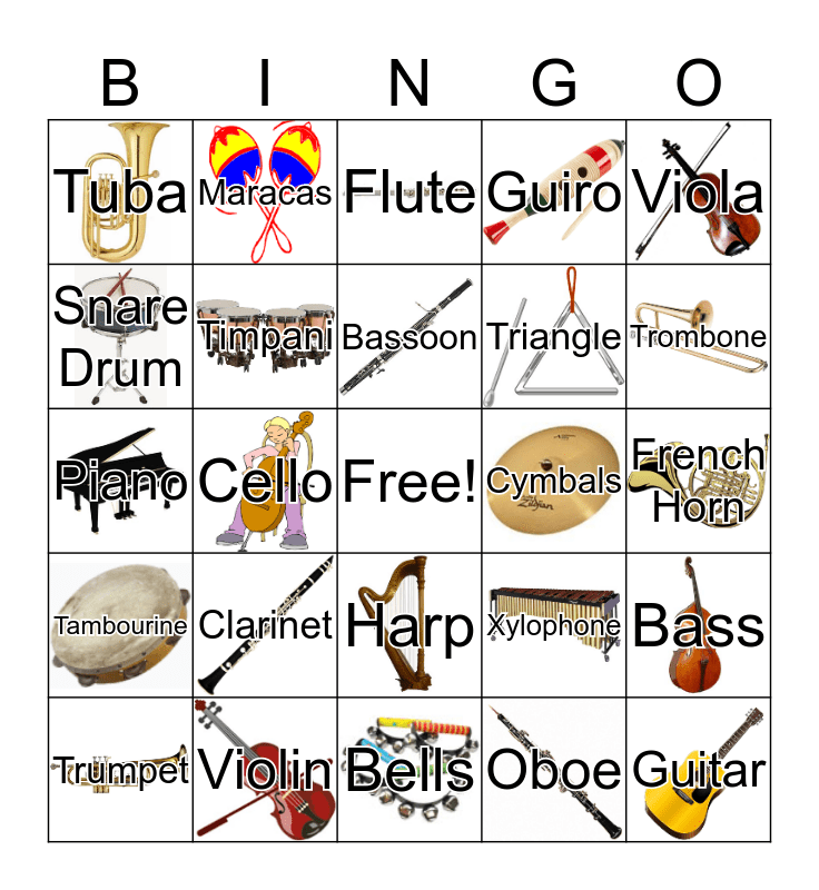 This bingo card has 24 images, a free space and 24 words: Clarinet, Violin, Bassoon, Trumpet, Viola, Tuba, Snare Drum, Maracas, Cymbals, Harp, Triangle, Piano, Xylophone, Bass, Timpani, Oboe, French Horn, Flute, Trombone, Cello, Guitar, Tambourine, Guiro and Bells.