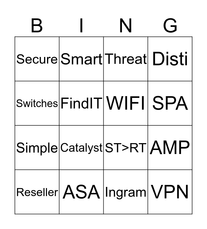 This bingo card has 16 words: ASA, AMP, Threat, Secure, Simple, Smart, ST>RT, Ingram, Switches, FindIT, Reseller, Disti, Catalyst, SPA, WIFI and VPN.
