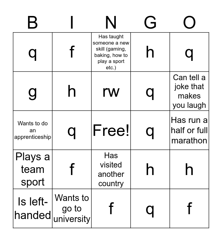 This bingo card has a free space and 48 words: f, f, f, f, f, f, f, f, g, h, h, h, h, h, h, q, rw, q, p, q, q, q, q, q, Has a part time job, Can tell a joke that makes you laugh, Is left-handed, Speaks another language, Has visited another country, Plays a team sport, Plays in a band, Has a secret hobby, Has been to an office before, Is taller than 6 foot, Wants to go to university, Has completed some work experience, Volunteers regularly, Has run a half or full marathon, Looks after their younger brother or sister, Is a great cook, Knows how to make a website, Can pat their head and rub their stomach at the same time, Has taught someone a new skill (gaming, baking, how to play a sport etc.), Has read 2 books this year already, Wants to do an apprenticeship, Knows what the civil service does, Has fundraised for charity and Is wearing contact lenses.