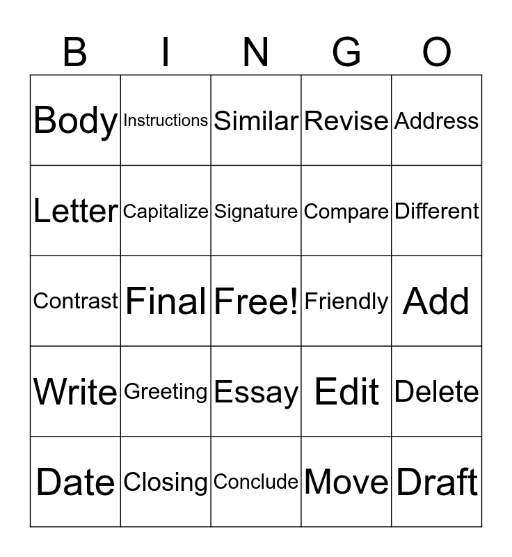 This bingo card has a free space and 24 words: Greeting, Closing, Signature, Date, Address, Body, Letter, Instructions, Friendly, Essay, Compare, Contrast, Edit, Delete, Capitalize, Move, Add, Similar, Different, Final, Draft, Write, Revise and Conclude.