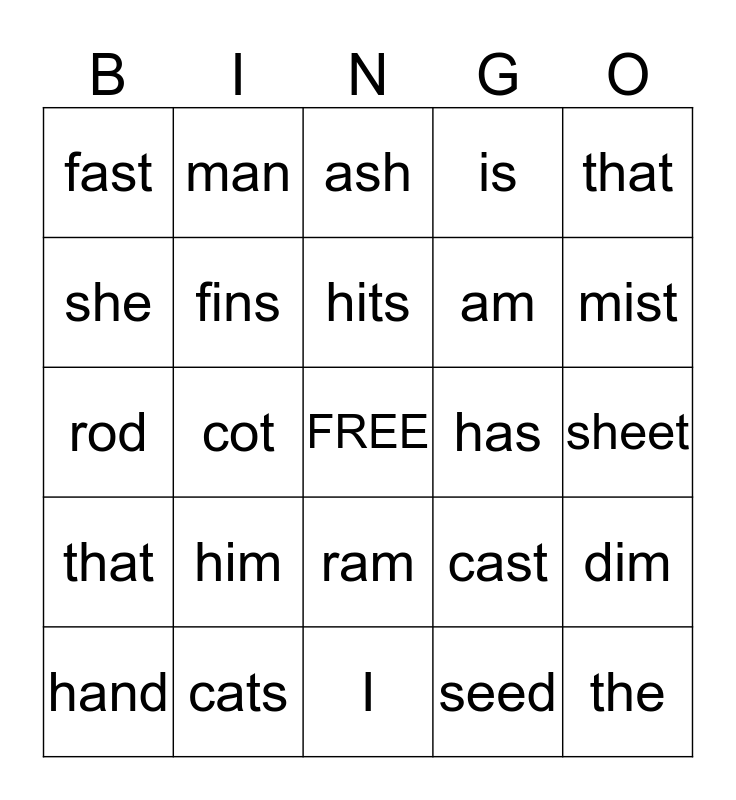 This bingo card has a free space and 24 words: him, cats, hits, hand, that, fast, she, man, has, ram, am, rod, cast, dim, fins, seed, sheet, ash, mist, cot, the, that, is and I.